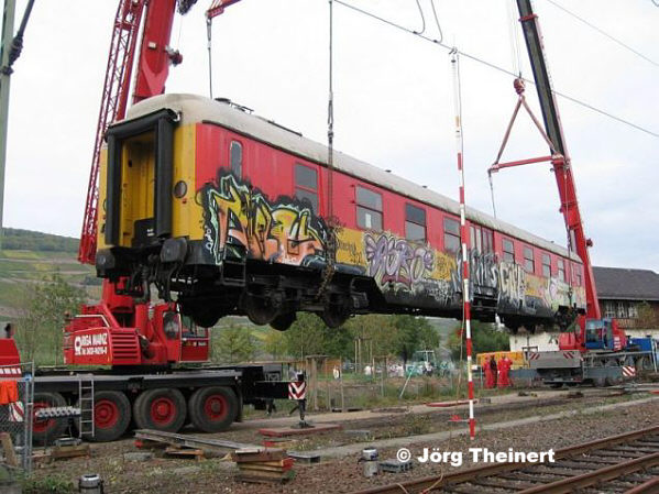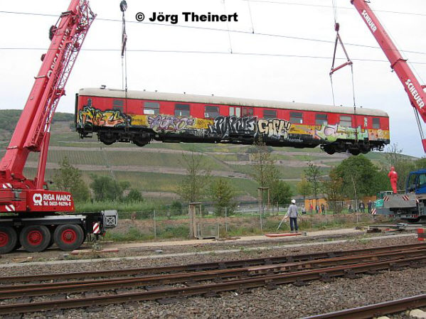 Bei diesem Wagen handelt es sich um einen ehemaligen Lazarettwagen des United States Transportation Corps (USTC), der in der ersten Hälfte der 70er Jahre von der DB übernommen wurde. Im Gegensatz zum komplett roten 60 80 99-03 000-9 hat der Wagen seine noch aus DB-Zeiten stammende gelbe Farbgebung behalten, die nur im Bereich des Fensterbandes in rot ergänzt wurde. Am 01.10.2007 wurde der Wagen in Bingen "neben die Gleise gesetzt". Er soll der Landesgartenschau Bingen 2008 als "Grünes Klassenzimmer" dienen. Die beiden Bilder, die das Umsetzen des Wagens per Autokran zeigen, sind mir freundlicherweise von Jörg Theinert zur Verfügung gestellt worden.