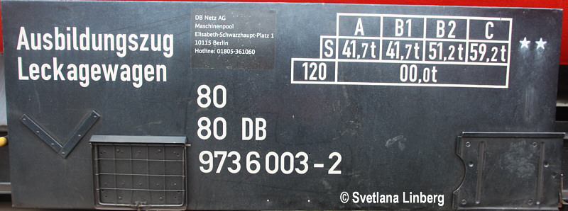 Mir liegen Bilder vor, die den Ausbildungszug kurz nach seiner Indienststellung zeigen. Deutlich zu erkennen ist die Anschrift "Leckage-Wagen (540)". Demnach handelt es sich bei der "540" eindeutig um die DR-Schlüsselzahl und der Wagen war tatsächlich den Materiallagerwagen zugeordnet. Weiterhin offen ist die Frage, ob und welche Bauartnummer der Wagen bei der DB AG bekommen hat?