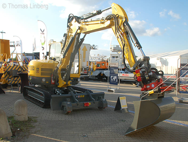 G 9915 007 Zweiwege-Minibagger Wacker Neuson 8003 Wacker Neuson Linz GmbH, A-Hörsching Freigabe zum Einsatz TEF 11 15.04.14 Herst. Wacker Neuson Linz GmbH Berlin-Messegelände, 23.09.2014 (InnoTrans 2014) Der Minibagger 8003 in der schienenfahrbaren Ausführung wurde sowohl auf der Steinexpo 2014 (Neumünster) als auch auf der InnoTrans 2014 (Berlin) erstmals der Öffentlichkeit vorgestellt. Erster Abnehmer dieses Modells ist die Leonhard Weiss Bauaunternehmung. Gegenüber herkömmlichen Zweiwegebaggern ist die größere Wendigkeit auf Grund der kompakteren Abmessungen größter Pluspunkt dieses Modells. Inklusive der Schienenfahreinrichtung wiegt der Bagger nur 10 t und ist damit nur halb so schwer wie die bislang gebräuchlichen Zweiwegebagger. Die Schienenfahreinrichtung ist vorne am Räumschild und hinten am Unterwagen befestigt und wird hydraulisch gesteuert. Optional kann der Bagger mit einem Verstellauslager versehen werden, womit er universell, beispielsweise sowohl für Böschungsarbeiten als auch für Arbeiten an Gleisanlagen, einsetzbar ist. Für Arbeiten unter Oberleitungsanlagen ist der Bagger mit einem Höhenbegrenzungssystem ausgestattet. Bei einem Ausfalld er Energieversorgung können alle notwendigen Funktionen auch hydraulisch ausgeführt werden. (Quelle: Homepage der Fa. Wacker Neuson (Stand: 12.10.2014 - InnoTrans 2014 und Leonhard Weiss) / Der Eisenbahningenieur Ausgabe 09/14) |