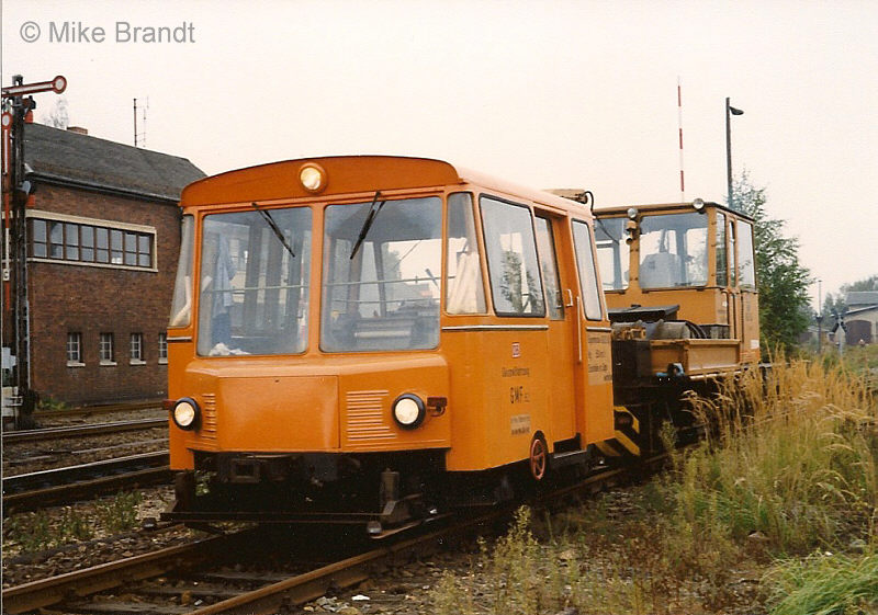 ![]() Das GMF 62 gehörte zum Oberbauwerk (Obw) Leipzig und anschließend bis zur Abstellung 1995 zur Bm Leipzig Hbf. Danach soll das GMF 62 nach Magdeburg als Ersatzteilspender für das GMF 71 gekommen sein. Zugfahrzeug auf den beiden Bildern ist übrigens MZG 64. Geithain, September 1995 Bildautor: Mike Brandt |