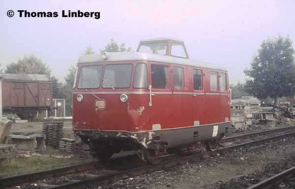 Beim Klv 10 4001 handelt es sich um ein Einzelstück, das 1952 von der Firma Draisinenbau Dr. Alpers in Hamburg unter der Fabriknummer D10730 hergestellt wurde. Das Fahrzeug hat laut Betriebsbuch einen Deutz-Motor (Typ F4L 514) mit 74 PS und einem 4-Gang-Schaltgetriebe. Der Ursprung dieses Motortyps stammt übrigens aus dem Traktorenbau. Der Klv 10 4001 (Bauart 100) diente der BD Hamburg zur Bereisung der Strecken im Direktionsbereich. Neben dem Fahrer konnten maximal 12 Personen befördert werden. Für die Streckenbeobachtung hatte das Fahrzeug eine gläserne Aussichtskanzel auf dem Dach. Am 18.09.86 um 16.37 Uhr (laut Unfallprotokoll) hatte das Fahrzeug einen Unfall auf der Strecke Neumünster - Ascheberg bei km 82,325 (Bahnübergang) in der Nähe des Bahnhofs Bokhorst. Bereits zwei Tage später konnte ich ihn abgestellt in Neumünster fotografieren. Nach der Abstellung und Ausmusterung des Fahrzeugs durch die DB wurde der Wagen 1987 von den Eisenbahnfreunden Mittelholstein e.V. übernommen und nach dem Transport nach Kleinkummerfeld dort restauriert. Mittlerweile fährt dieser interessante Einzelgänger wieder aus eigener Kraft, wie hier eindrucksvoll zu sehen ist.