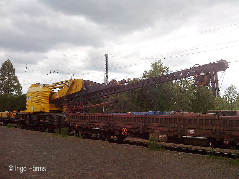 99 80 9 210 001-0 D-SPAG Krupp-Gleisbohrramme Fa. Spitzke-Schomburg GmbH, Leer Roisdorf, 16.05.2016 Foto: Ingo Härms Als Schutz-/Begleitwagen fungierten 33 68 398 8 029-9 D-AAEC Rens 1 und 27 80 3302 125-6 D-SPAG Ks Ähnlich wie bereits bei 97 83 01 502 17-2 wurde auch diese Ramme auf einem alten Kranwagen-Untergestell aufgebaut. Ist das das Untergestell von Bully (97 82 46 504 17-6)? Hat evtl. jemand weitere Informationen dazu? |