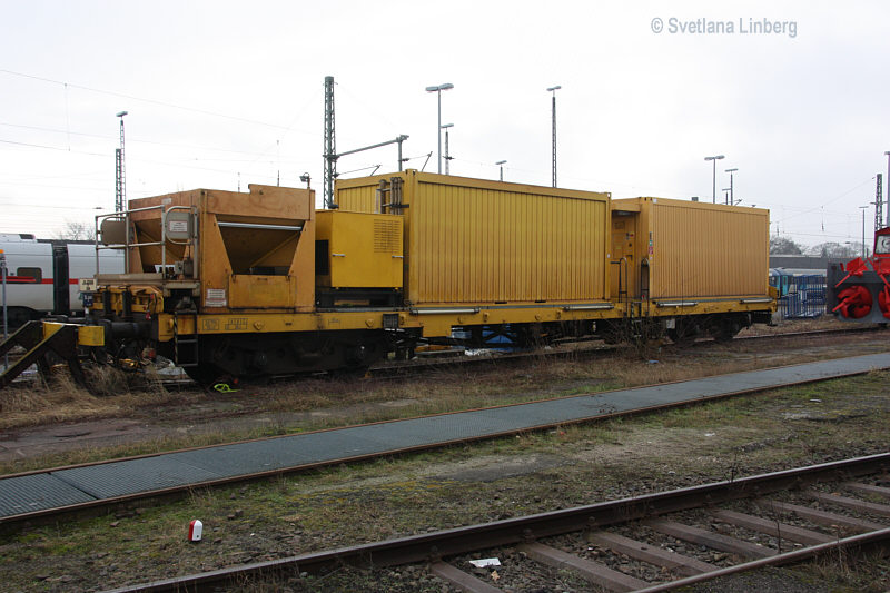 99 80 9 310 029-0 D-DB Material-/Spänewagen für SF03 99 80 9 420 140-2 DB Netz AG, Maschinenpool, Berlin 6 REV BGD 1 19.01.21 ex 31 80 390 5 945-2 Herst. LHB 1965 Berlin-Grunewald, 08.03.2024 Anmerkung: Der Wagen trägt die Bauartnummer 233 |