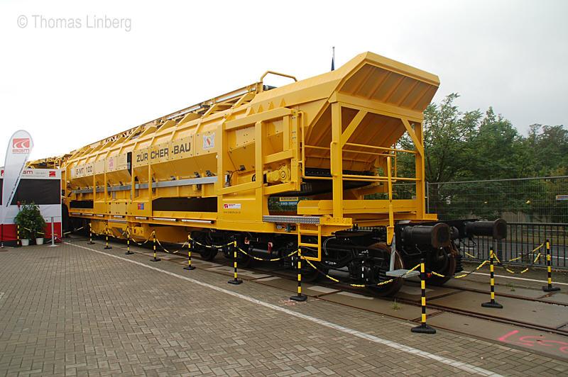 Die neuartigen Materialtransportwagen sollen den üblicherweise hohen Maschinenaufwand in Gleisbaustellen verringern. So können beispielsweise über den herkömmlichen Bodengurt und einen zusätzlichen Dachgurt Schüttgut und Aushub gegenläufig transportiert werden.