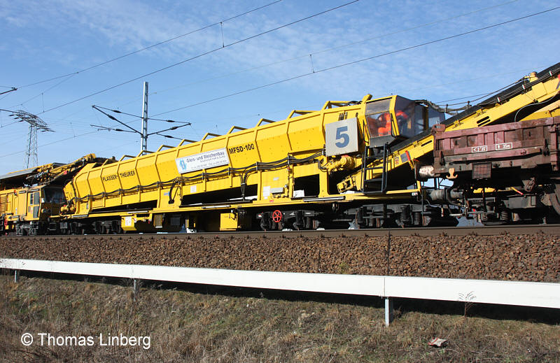 Insgesamt waren fünf MFS 100, MFS 100 S bzw. MFS 100 D im Einsatz, darunter die gezeigte 97 19 29 551 57-2 (MGW-intern Nr. 5, Plasser & Theurer 2003/4065). Dabei handelt es sich um eine reine Durchladeeinheit, d.h., dass das Übergabeband nicht schwenkbar ist. Die weiteren MFS waren 97 19 34 536 57-6 (MFS 100; MGW-intern Nr. 9, Plasser & Theurer 2007/4955) 97 19 29 552 57-0 (MFS 100 S; MGW-intern Nr. 4, Plasser & Theurer 2003/4066) und 97 19 29 550 57-4 (MFS 100 D; MGW-intern Nr. 1, Plasser & Theurer 2003/4064) 97 19 34 539 57-0 (MFS 100; MGW-intern Nr. 12, Plasser & Theurer 2007/4958) |