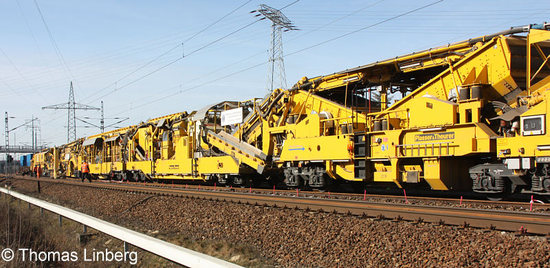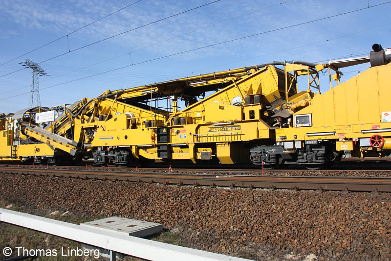 Das Bild beginnt rechts mit dem Siebwagen (der Motorwagen fehlt bzw. schließt sich nach rechts an). Es schließen sich nach links die beiden Wagen für das Schotterrecycling (Prallmühle und Schotterwaschanlage), die Aushubmaschine sowie der Antriebswagen an. Dahinter befindet sich noch der Materialwagen 33 68 3988 119-8, erkennbar an den blauen Containeraufbauten, an. Die Maschine war übrigens in der "kleinen Besetzung" im Einsatz, d.h. der Klärwagen 99 80 9 510 002-6 und der Tankwagen 33 88 4961 102-9 waren nicht vor Ort. |