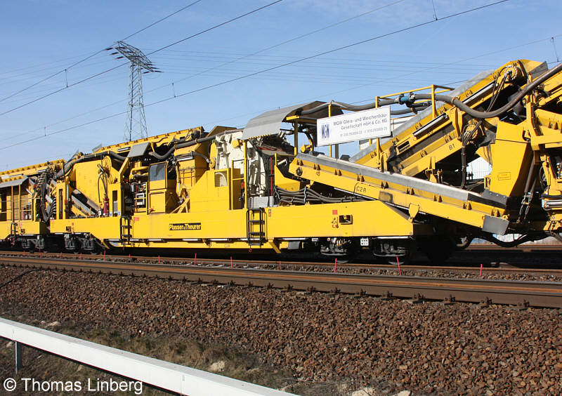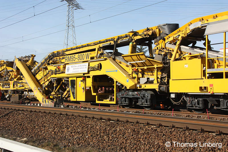 Einsatzbilder Bettungsreinigungsmaschine RM 95-800 WAm 03.03.2012 konnte ich die Bettungsreinigungsmaschine RM 95-800 W von MGW in Mahlow, ein paar Kilometer südlich von Berlin, im Einsatz beobachten. Zwischen dem Abzweig Glasower Damm und Flughafen Schönefeld sollten rund 1.200 m Gleis gereinigt werden, wobei am kommenden Wochenende die Gegenrichtung an der Reihe ist. Die technischen Parameter der RM 95-800 W habe ich bereits an anderer Stelle beschrieben, daher sollen hier zur Ergänzung nur ein paar Bilder aus dem Betriebsalltag gezeigt werden. |